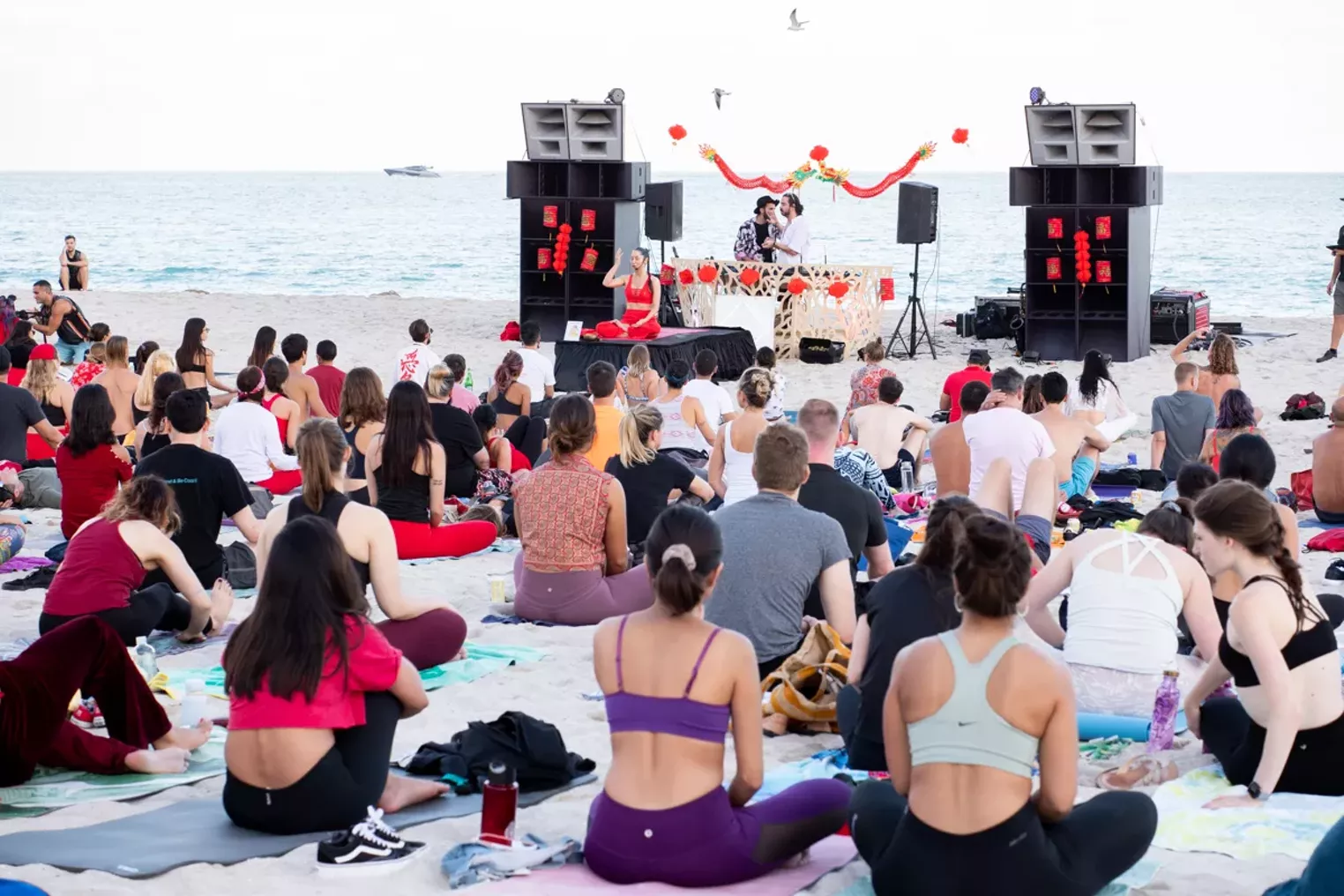 On Saturday, January 25, Daybreaker Miami brought its party with a wellness twist to the sands behind the Faena Miami Beach. The event celebrated Chinese New Year with a yoga session on the beach and a party at dusk to welcome the Year of the Rat. Photography by Daniella Mía.