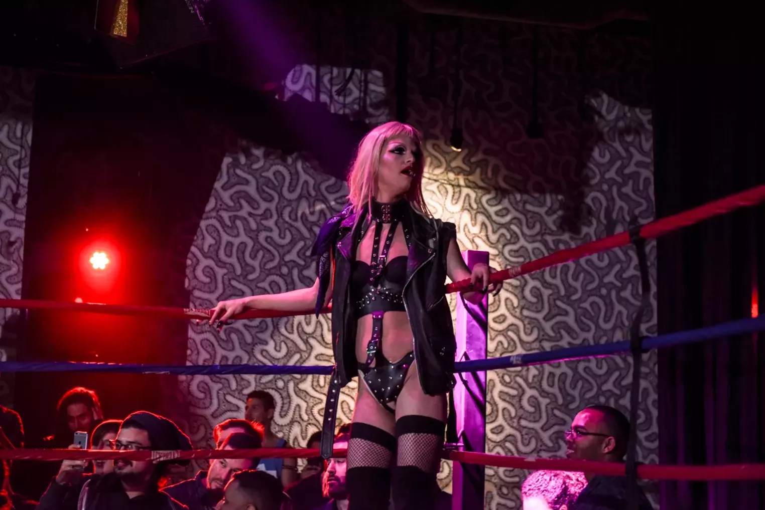A touch GLOW and a touch RuPaul's Drag Race, Celebrity Deathmatch at the Hangar brought together to Miami's most notorious drag queens. Taking inspiration from MTV show of the same name, the queens dressed up as their favorite diva celebrities — from Madonna to Cher — to battle it out in front of a cheering audience.